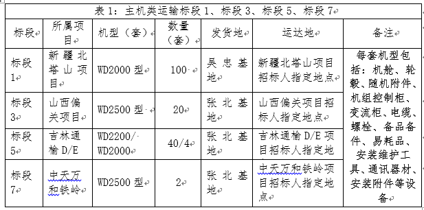 (1)主機類(含機艙、輪轂及相關附件等)運輸:分標段1、標段3、標段5、標段7共4個項目4個標段;