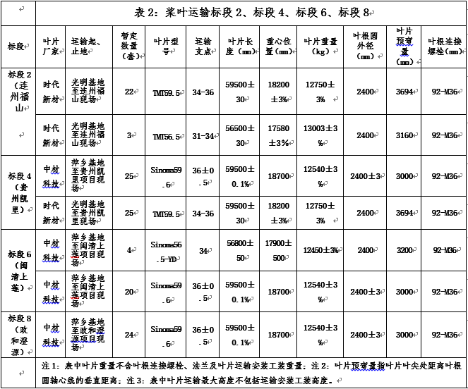 2.2? 槳葉運輸(含長(cháng)途運輸、道路改道、二次轉運等)標段的劃分及運輸技術(shù)參數